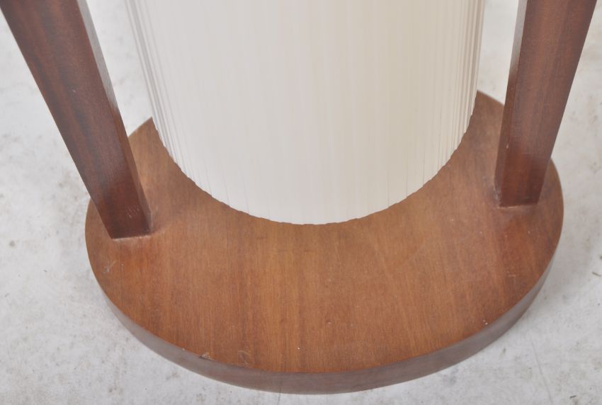 Rocket Lamp - A retro 20th Century teak wood and spun fibreglass floor standing lamp light comprising of a double bulb fitted centre, cylindrical fibreglass shade / diffuser. The shade supported by teak struts with brass pins all being raised on an oval teak wood base. Wear commensurate with age, loose base and sold as untested, overall good. Measures approx; 107cm x 28cm.