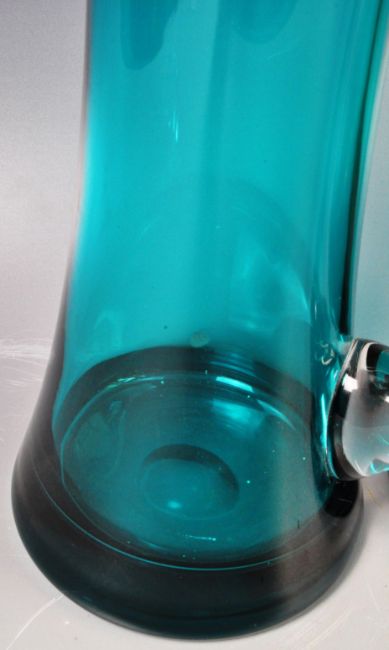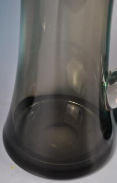 Whitefriars - A collection of three retro vintage 20th Century 1970's water pitchers / jugs with two in Kingfisher blue and the other smokey grey. All with clear handles and smoothed pontil marks to base. Each measures approx; 37cm x 11cm diameter.