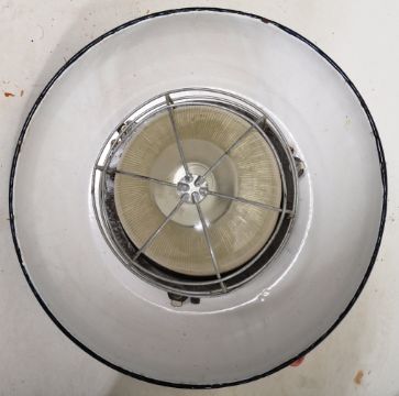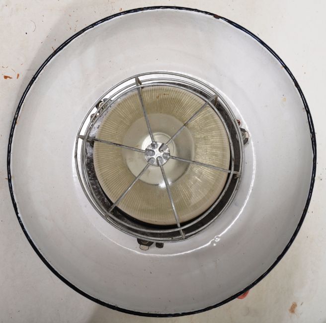 A pair of retro vintage 1930's industrial factory pendant light lamp shades having a green enamel finish with white enamel interior and holophane glass diffusers. Measures approx; 25cm wide.