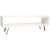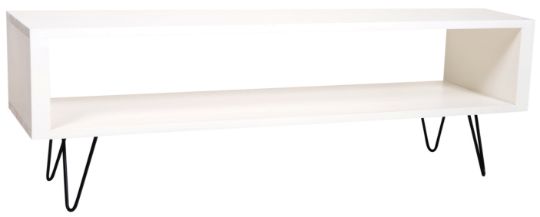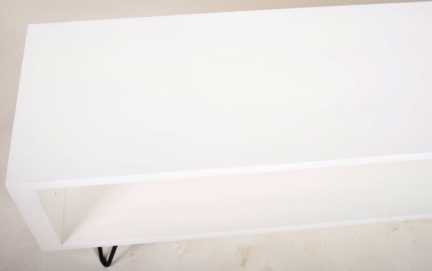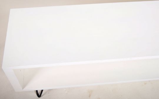 A contemporary modernist minimalist white laminated low & long sideboard credenza cabinet media unit / television stand comprising of an open section raised on short hairpin legs. Measures approx; 46cm x 140cm x 40cm.