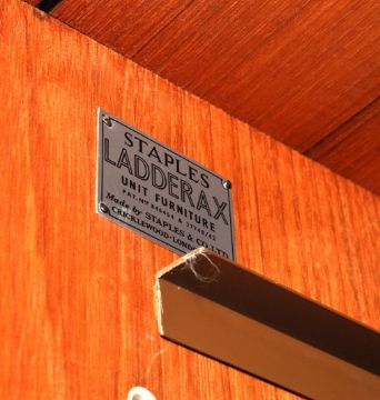 Robert Heal - Staples - Ladderax - An original retro vintage 20th Century 1970's teak wood single bay modular wall unit comprising of two teak ladder uprights having a sliding door cabinet with ten shelves below. Measures approx; 202cm x 94cm x 36cm.