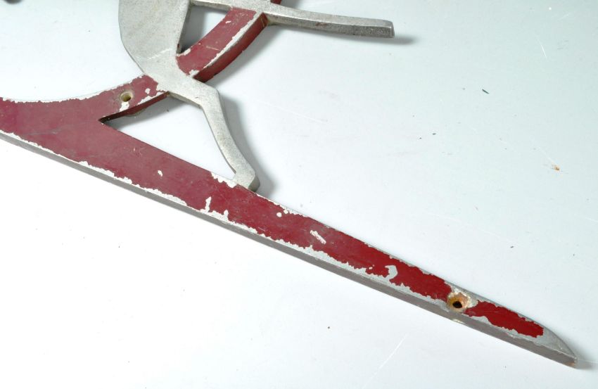 An original vintage 1950's metal advertising point of sale motoring transport related sign for Greyhound buses / lines featuring a running / leaping greyhound in brushed metal within a circular red painted border frame. Measures approx;