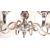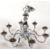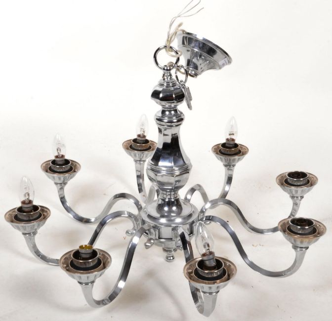 A late 20th Century large eight arm white brass / chrome effect hanging chandelier / electrolier having a central faceted column with shaped scroll arms. Each arm having shaped glass shades. Minor wear, overall good. Measures approx; 61cm x 75cm diameter.
