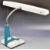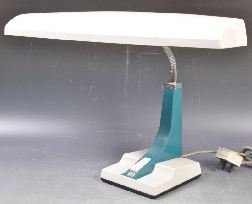 Trident - Model 955 - De-Luxe - An original retro vintage 20th Century industrial work desk lamp having an elongated plastic shade raised on articulated gooseneck on square base. Original labels and push button to base. Measures approx; 48cm wide.
