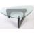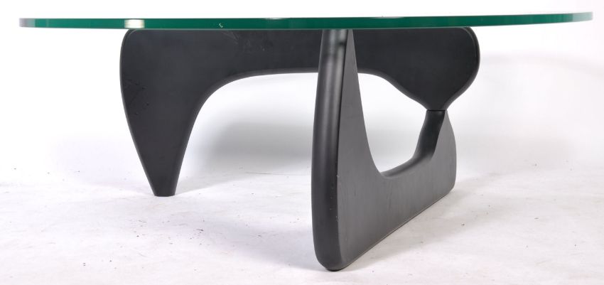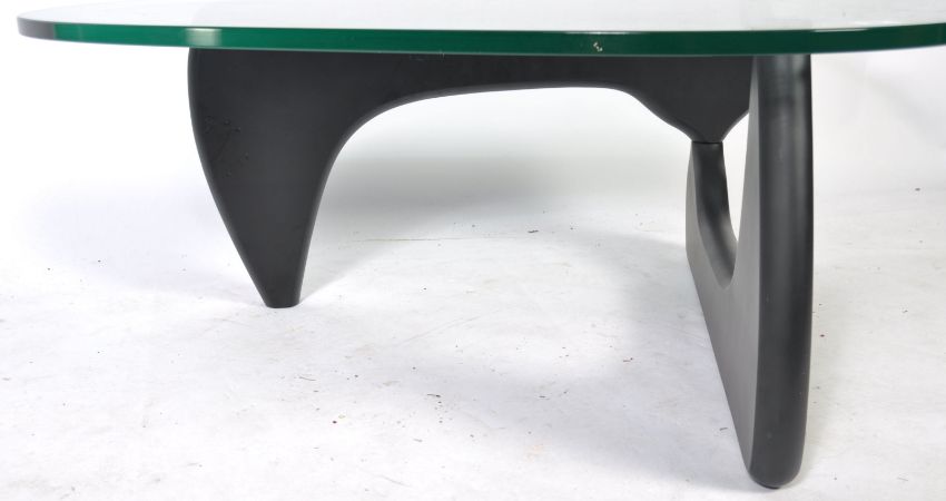 After Isamu Noguchi - Noguchi Table - A contemporary glass topped coffee table. The table comprising of two shaped sections of ebonised ash connected with pin and splayed at a right angle with a large heavy shaped glass top. Originally designed in 1944. Measures approx; 39cm x 128cm x 94cm.