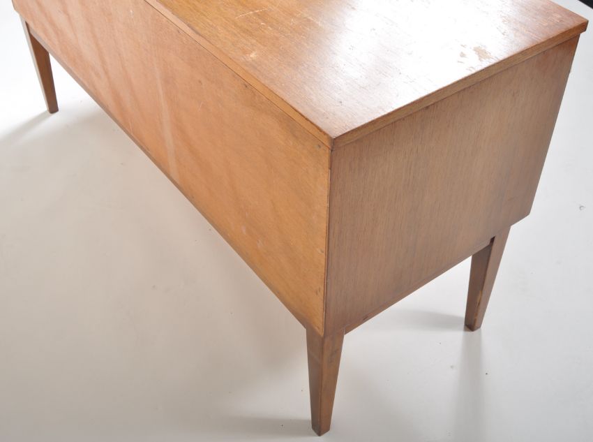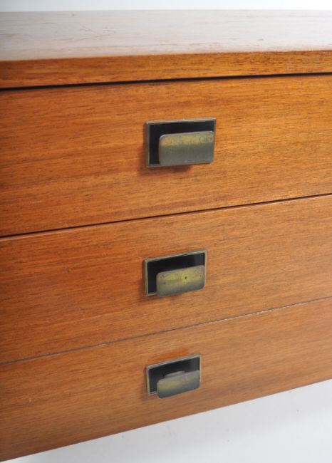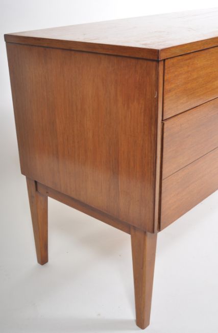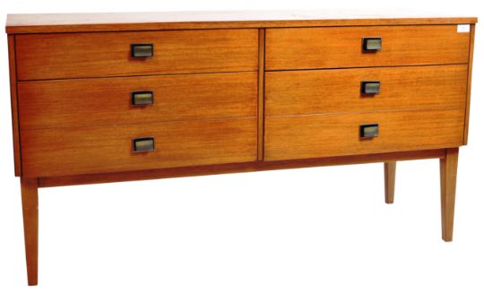 A retro vintage 1970's teak wood sideboard credenza comprising of two banks of drawers with a smaller top drawer and a conjoined larger single bottom drawer to each side. All raised on shaped supports. Measures approx; 68cm x 128cm x 46cm.