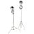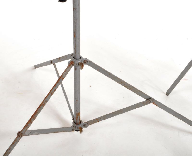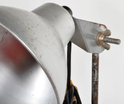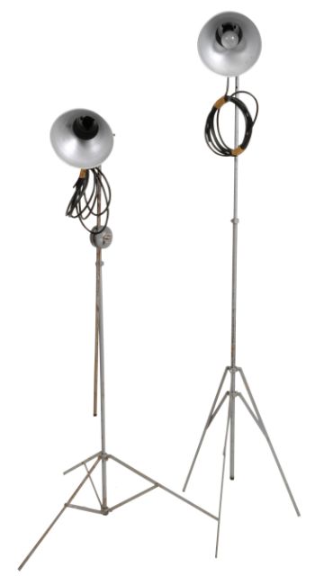 A pair of retro vintage 1950's industrial photography studio lamps / lights raised on adjustable tripod bases with brushed metal conical shades. Partial makers label to one. Measures approx 160cm however is adjustable.