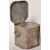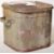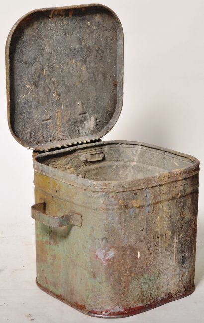 A retro vintage mid Century galvanised painters brush tin / office workshop bin with remnants of paint splatter throughout with embossed company name to the top. The hinged lid opens to reveal a hollow interior with carrying handles to each side. Measures approx; 30cm x 40cm x 37cm.