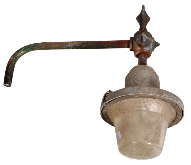 A retro vintage 1950's industrial factory exterior wall mounted light / lamp having a ribbed holophane glass shade with steel mounting arm. Measures approx; 60cm.