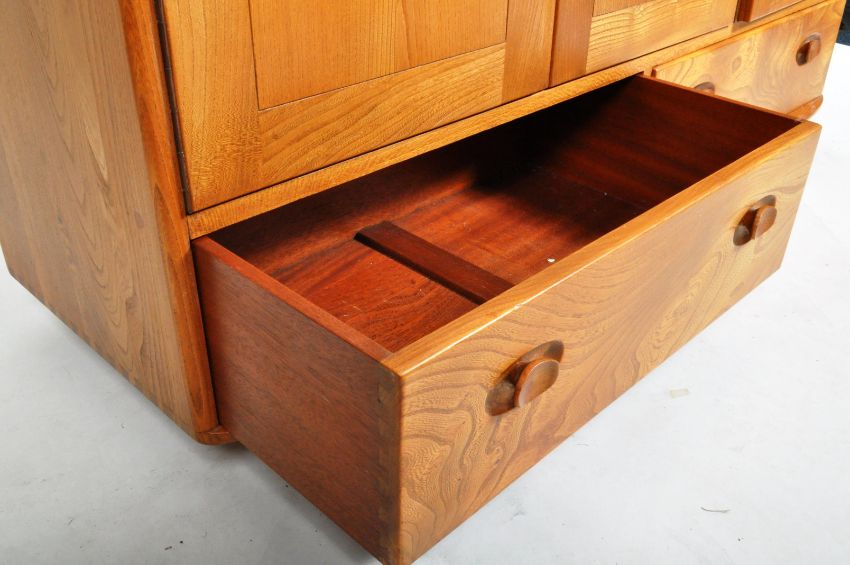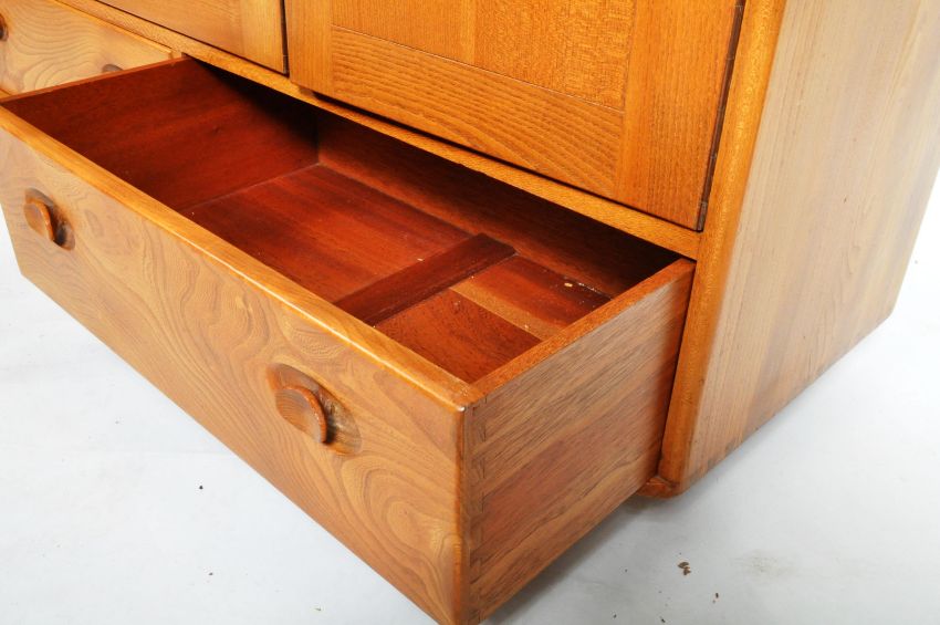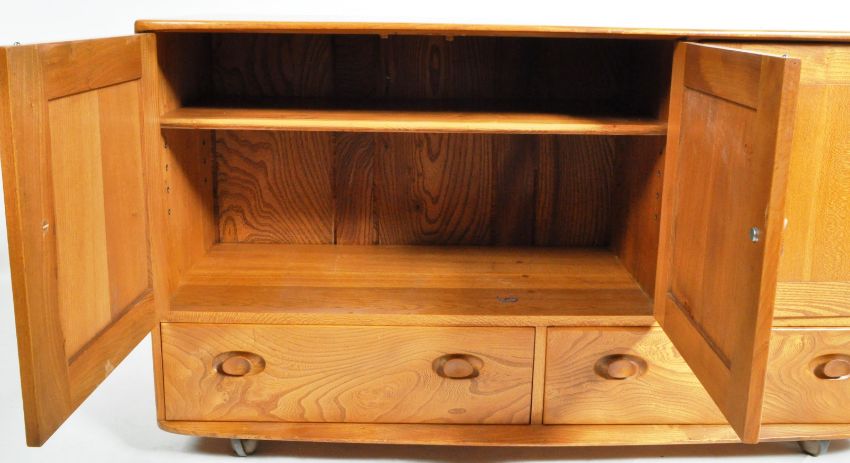 Lucian Ercolani - Ercol - Windsor - Model 468 - A retro vintage 1960's solid elm wood sideboard credenza having a twin door shelved cupboard alongside a single door cupboard with drawer, all above two wide drawers below. All being raised on ball castors. Overall good condition. Measures approx; 76cm x 130cm x 49cm.