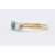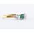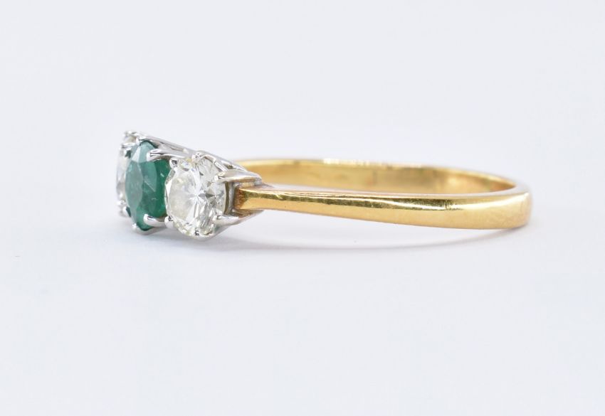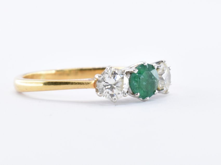 An 18ct gold diamond and emerald three stone ring set set with a central round cut emerald flanked by two round cut diamonds. London import mark 750 to the band. Weight 2.8g. Size N.5. Total diamonds estimated 0.54 ct. Emerald measures approx 4.8mm diameter.