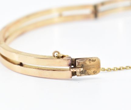 A French 18ct gold Art Deco bangle bracelet having a split band set with rose cut diamonds with a cream tone pearl set to the centre. Eagle mark to the tongue in groove clasp. Weight 15.2g. Measures 15.5cm circumference.