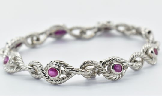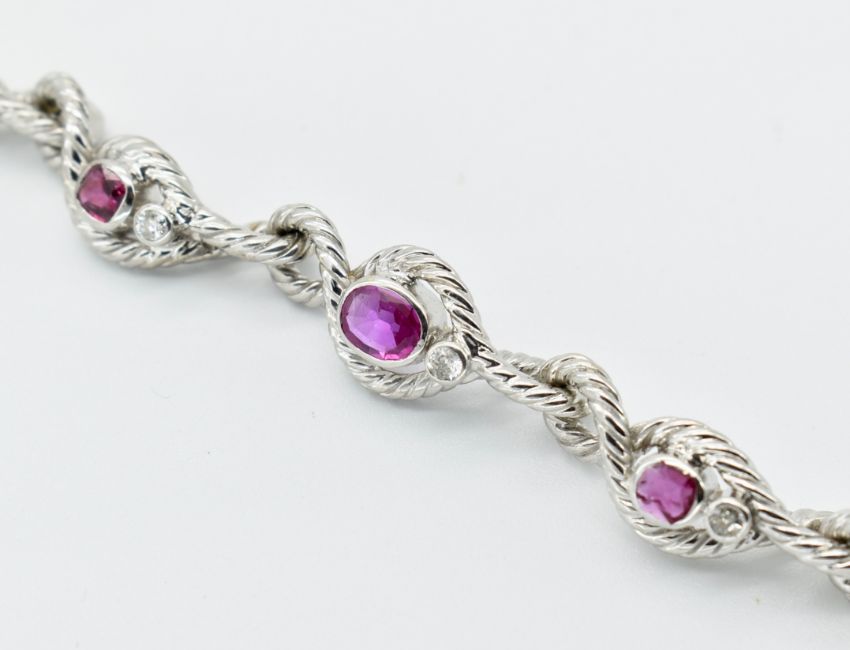 A French 18ct white gold ruby and diamond bracelet having rope twist design links set with oval cut rubies and round cut diamonds. French eagle mark to the clasp. Measures 18cm. Weight 32.1g. Principle ruby measures 2.3 x 4.7 x 6mm.