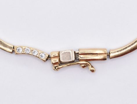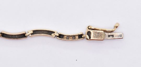 A 9ct gold ladies line bracelet having curved links being alternately set with white accent stones, having a tongue in groove clasp. Clasp marked 375. Weight 4.7g. Measures 7.5 inches.