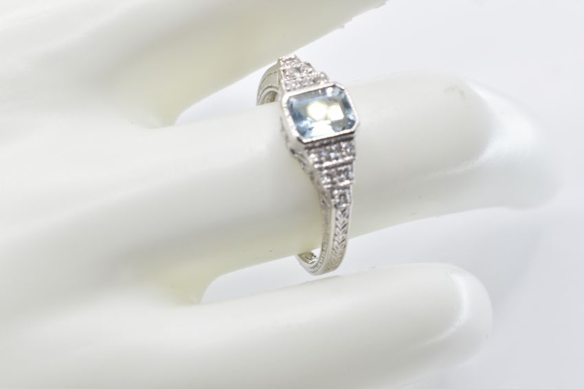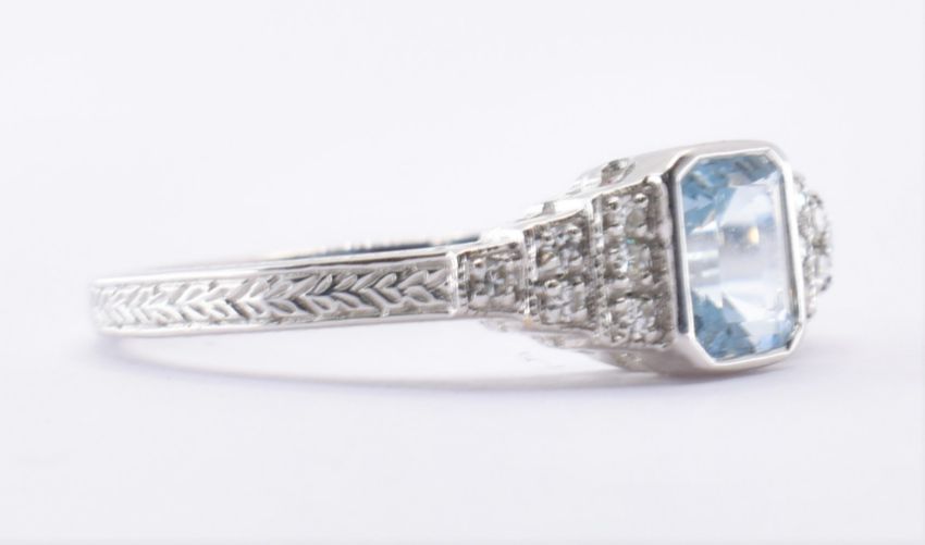 An 18ct white gold aquamarine and diamond ring having a rectangular cut aquamarine to the centre having stepped shoulders set with diamond accent stones. Weight 2.8g. Size N. marked 750.