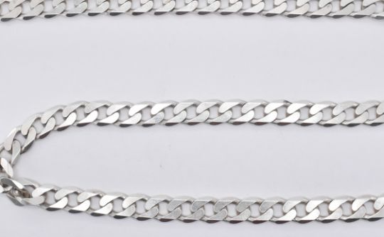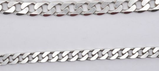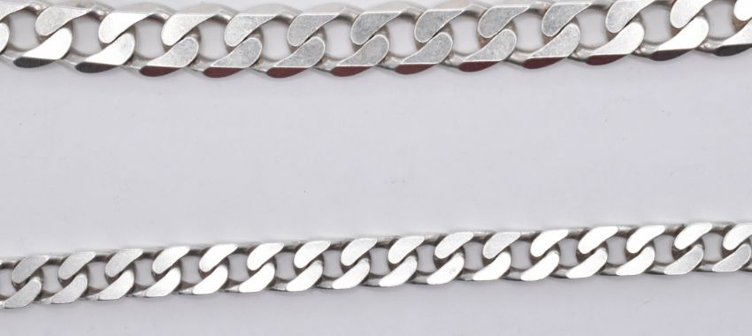 A large 925 silver flat link necklace chain having a lobster clasp together with a flat link bracelet chain. Both marked 925. Weight 75.2g. Necklace measures 22 inches, bracelet measures 8.5 inches.