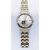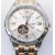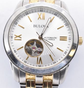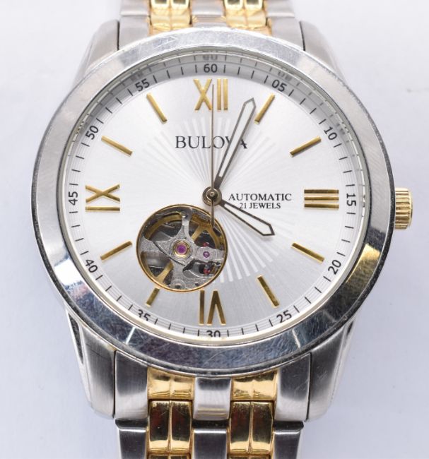 A Bulova automatic 21 jewels stainless steel wrist watch having a round face with a silvered dial with roman numerals to the chapter ring, exposed mechanism to the back and a two tone bracelet strap. Water Resistant. Face measures 3.5cm wide.