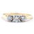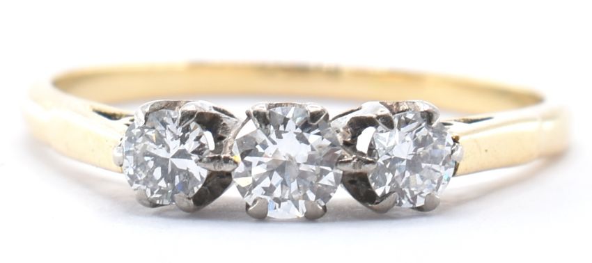 An 18ct gold and diamond three stone ring set with three graduating diamonds in cathedral settings. Marked 18ct. Weight 2.2g. Size O. Total diamonds estimated at 50pts.