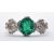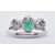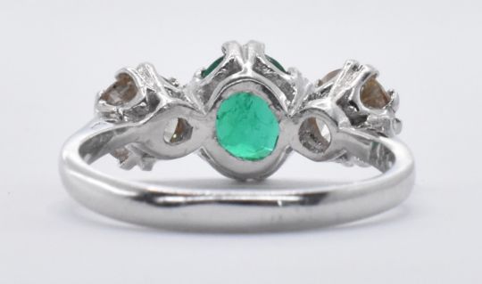 An 18ct gold diamond and emerald three stone ring set with a round cut emerald to the centre flanked by two round cut diamonds. Diamonds measure approx 6mm diameter, emerald measures 7 x 6mm. Weight 3.7g. Size M.5. Marked 18ct to the interior of the band.