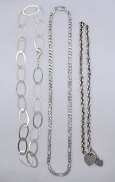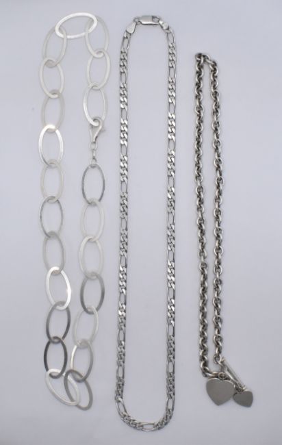 A group of three silver necklaces to include a flat link figaro chain, a round link chain with heart toggle, and large flat oval link chain. All marked 925. Total weight 69.7g. Longest chain measures 20 inches.