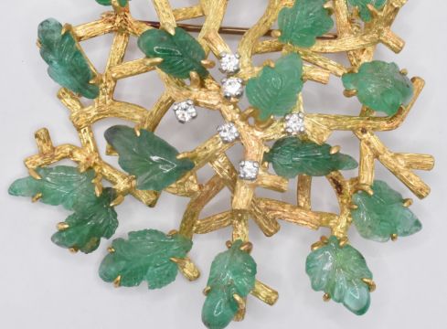 A large vintage 1970's 18ct gold and carved emerald brooch / pendant constructed from gold branches with carved emerald leaves and set with six round cut diamonds. Hinge pin and pendant bale to verso. Hallmarked to the bale for London 1973, EHRT. Measures approx 5.3cm wide. Weight 27.8g. Matching earrings listed in the following lot.