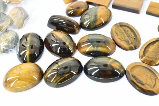 A large selection of fashioned tigers eye to include cabochons plaques. Largest 5.5cms.Total weight approx 240g.