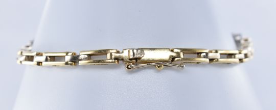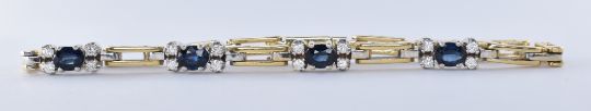 A stamped 14ct yellow gold bracelet set with four oval cut sapphires, each flanked by two diamonds at each side and separated by gold bar link spacers. The bracelet having a box clasp with safety clasp. Sapphires measuring approximately 40mm x 50mm. Measures 17cm in length. Total weight 12.35g.
