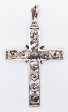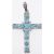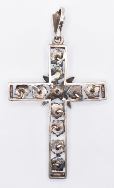 A 19th Century Austro Hungarian silver crucifix open work pendant being set with turquoise cabochons and seed pearls throughout having a fan shaped bale. Austro Hungarian lion mark to the bale. Weight 10.3g. Measures 7cm. Good condition commensurate with age.