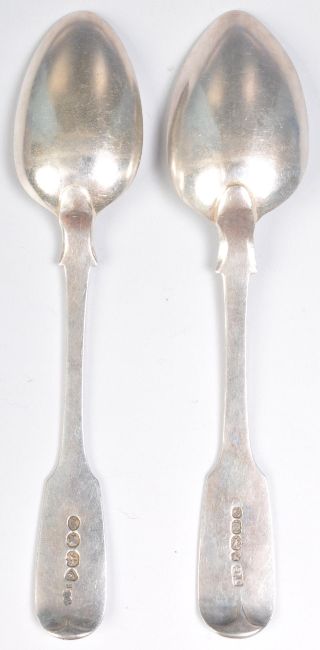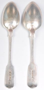 Two 19th Century silver fiddle pattern spoons each having engraved initials to the terminals, one hallmarked Exeter 1850 being makers marked for Josiah Gregory the other hallmarked London 1832 with makers marks for William Eaton. Both spoons measure 14cm. Weight 44.9g.
