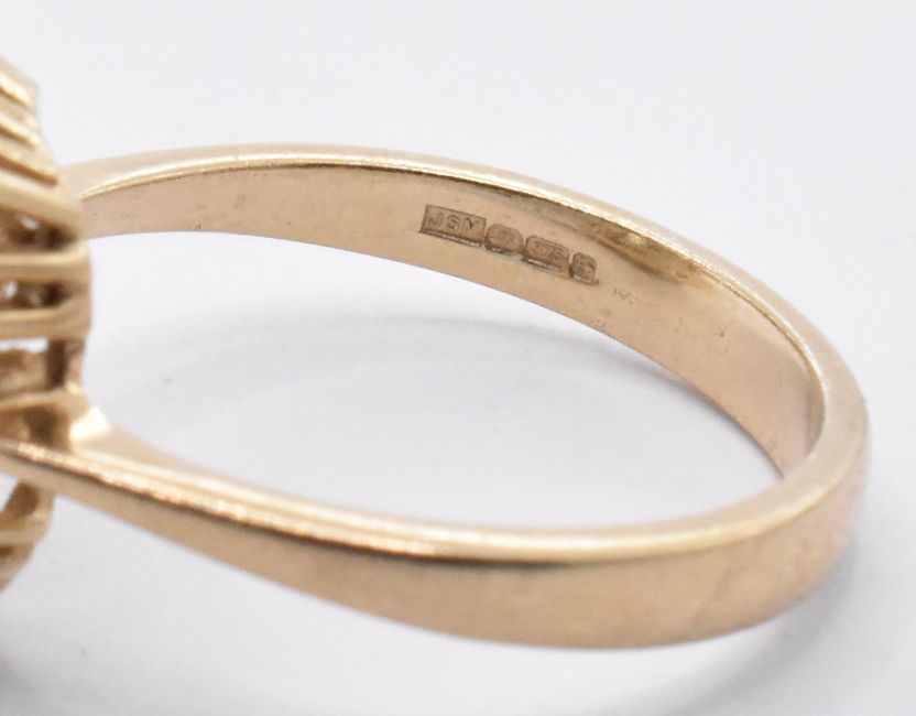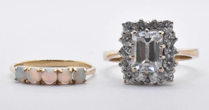 A 9ct gold and opal five stone ring set with five round opal cabochon. London assay mark to band. Weight 1.0g. Size K.5. Together with a 9ct gold and white stone cluster ring having a rectangular cut white stone to the centre and a halo of round cut white stones. Assay marked for Birmingham. Weight 4.3g. Size O.