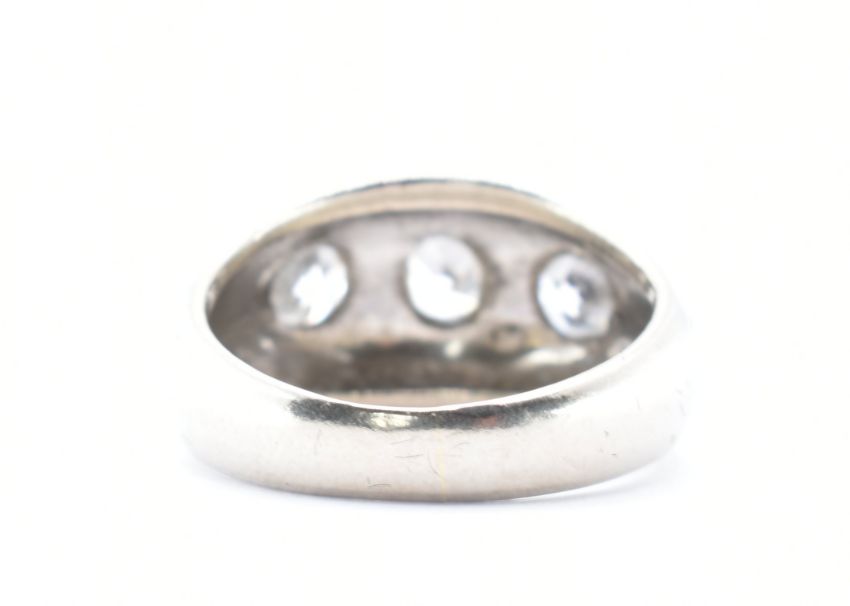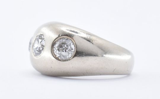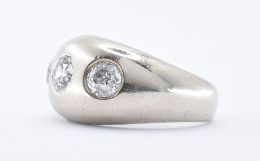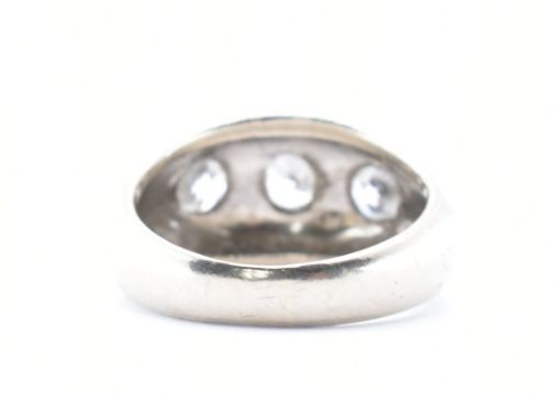 A stamped 14ct white gold and diamond gypsy ring having three white stones within flush settings. Size K / K.5. Total weight 7.09g.