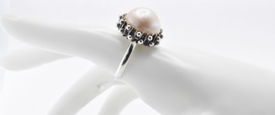 A silver white metal ring and pendant jewellery suite being set with cream half pearls in decorative beaded basket mounts. Tests indicate silver. Pearls measure approx 16mm diameter. Weight 15.3g. Ring size U.