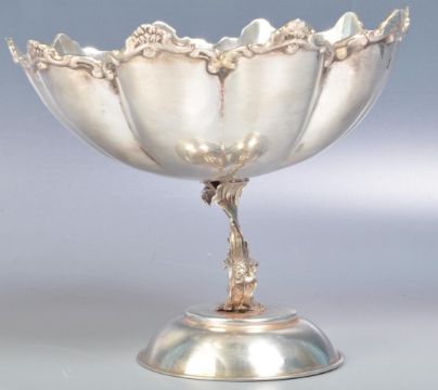 A 20th century silver tazza bowl having a moulded crenelated rim with gadrooned shaping to the bowl raised on a support moulded as a Maltese dolphin on a round base. Illegible marks to the base, tests as silver. Measures 12.3cm tall. Weight 202g.