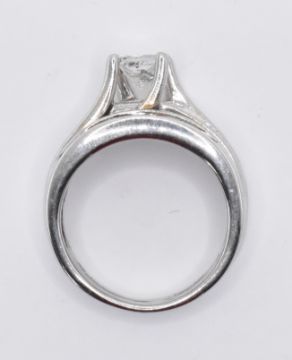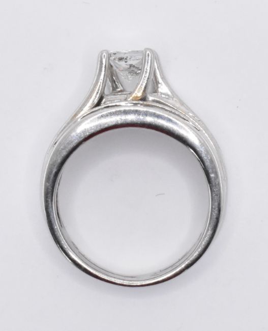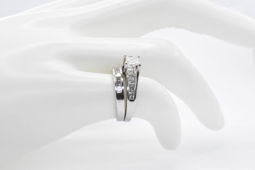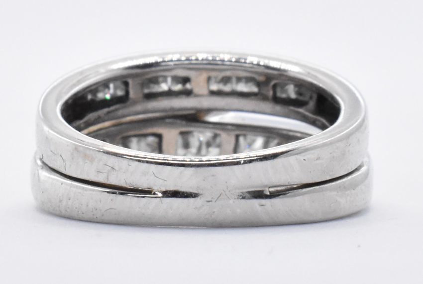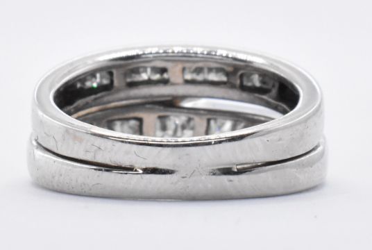 A stamped 14ct white gold gold ring having a princess cut diamond held in a claw setting upon a half eternity ring with an adjoining half eternity ring, both having a single row of princess cut diamonds in a pave setting. Ring size H. Total weight 5.13g.