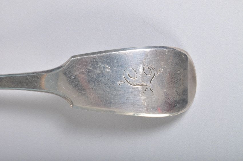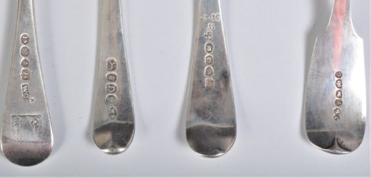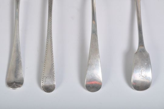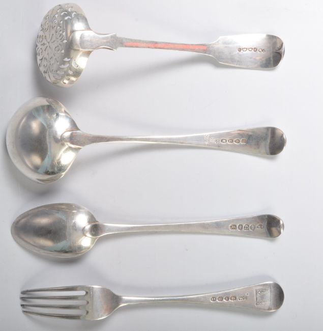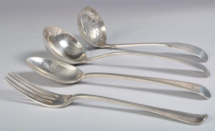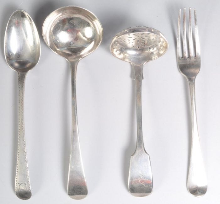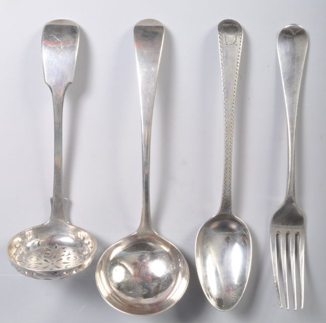 A group of silver hallmarked 19th century flatware - spoons to include a desert fork hallmarked for William Chawner, London, 1824 and a sauce ladle hallmarked of London, 1806. Together with a desert spoon hallmarked for William Sumner, London, 1799 and a tomato server hallmarked for John Stone, Exeter, 1840.  Total weight 195g.