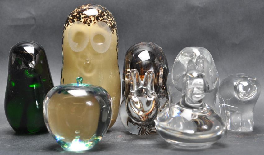 A collection of seven vintage retro 1970’s Wedgwood studio art glass paperweights. The collection includes an elephant, polar bear, duck, apple, snail, owl and a bird. All with makers marks to the underside.12cm tall.