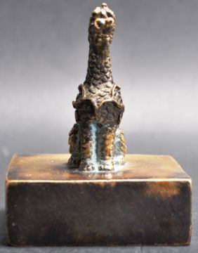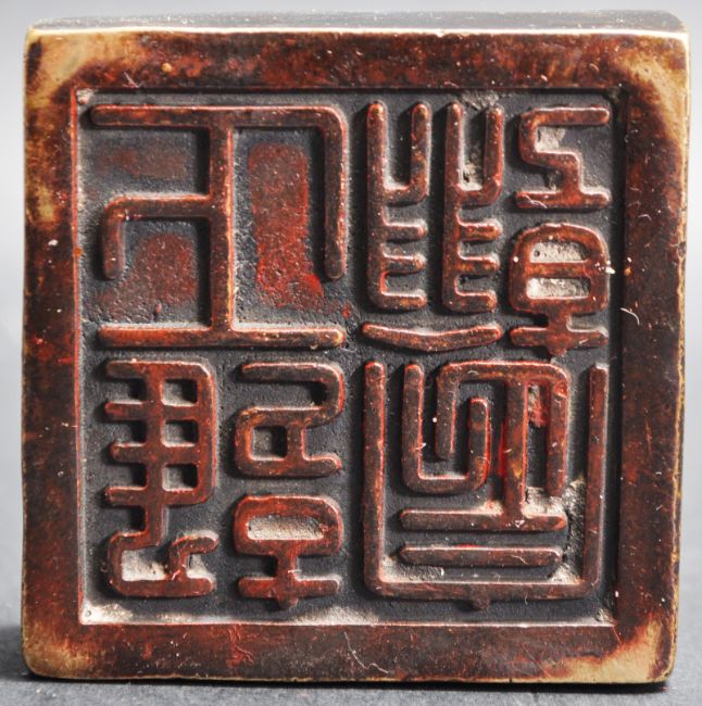 A Chinese oriental bronze stamp / desk stamp. The stamp having a Chinese Fu dog / dragon raised motif of square plinth base with Chinese characters to the underside.