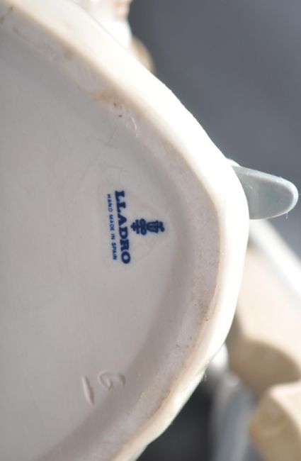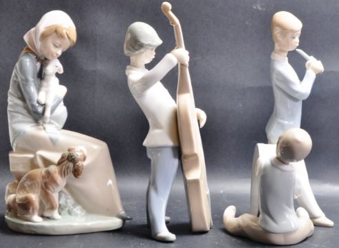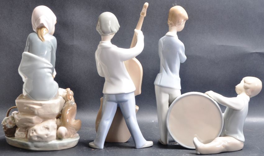 A group of three Spanish ceramic porcelain figurines by Lladro. The collection comprising of Jealousy / aka Devotion - 1278, Boy With Double Bass - 4615, Boys Playing the Drum And Hand Flute. Tallest measures 25cm.