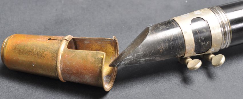 A vintage mid 20th century French ebonised wooden clarinet having a flared end with chrome metal keys. Stamped M Martin to the edge. Measures 69cm high.