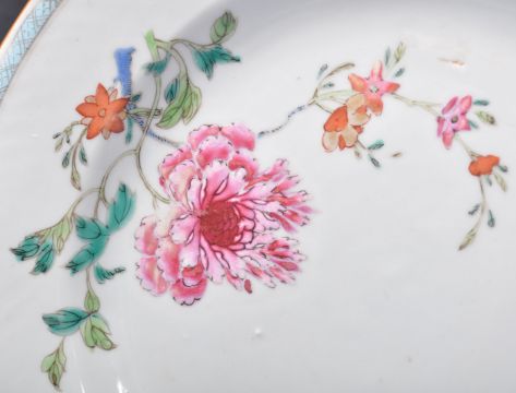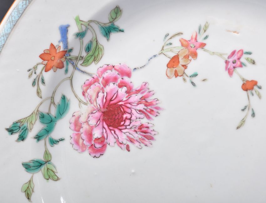 Two 18th century Chinese oriental ceramic porcelain plates / dinner plates of a circular form decorated with floral sprays raised on a circular foot. No makers marks. Measures, 23cm Diameter