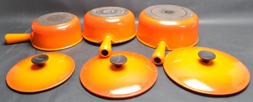 A collection of vintage 20th century French cast metal and enamel Le Creuset style kitchenware comprising of three orange lidded frying pans with tapering handles. Stamped Cousances to the handle. Largest measures 35cm wide.