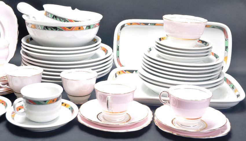 A late 20th century circa 1980’s ceramic porcelain tea service and dinner service by Thomas Germany. The service comprising of cups, saucers, plates, lidded pot, bowls and many more together with a Colclough china tea service in pink pattern. Makers marks to the underside.