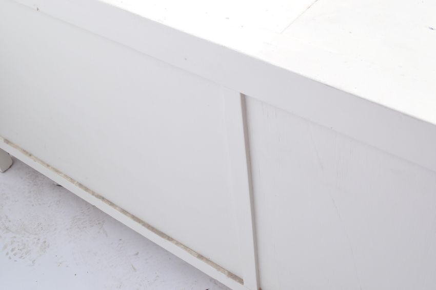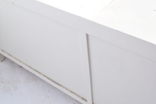 An early 20th century circa 1920’s shabby chic white painted sideboard. The sideboard of a rectangular form with shaped edges, back of three drawers to the centre flanked by single doors cupboards with drawer top, turned pull handles raised on shaped legs.