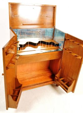 A vintage retro mid 20th century circa 1970’s light oak drinks cabinet / cocktail cabinet. The cabinet having a hinged metamorphic top and twin doors at the front opening to reveal a fitted interior with mirrors, bottles holder, drawer, and glass holders. raised on shaped legs. Measures 109 x 83 x 39 cm.