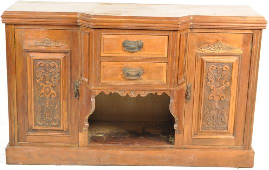 An early 20th century Edwardian mahogany sideboard credenza. The sideboard having a bank of two large drawers to the centre above an opened cupboard flanked by two cupboards with decoration to the panels raised on a plinth base. Measures, 93cm x 150cm x 55cm.
