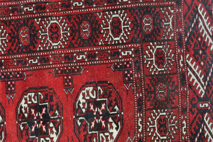 A 20th century Persian Islamic Afghan hand woven / knotted carpet rug having black and white hexagonal medallions separated by cross band motifs on a red field, black and white floral heads decoration to the main border linked by two small border decorated with “ S “ marks. Black and red pile direction to rack side and white fringes to each end. Measures 200cm x 145cm.