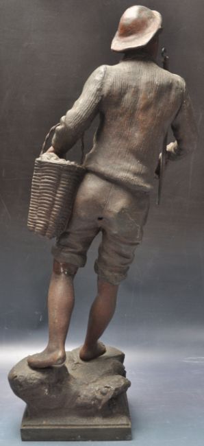 A late 19th century Victorian spelter figure in the form of a young man as a fisherman carrying a basket raised on a naturalistic base. Signed Rousseau to the base. 45cm high. Signs of wear and tear commensurate with its age. Measures 45cm tall.