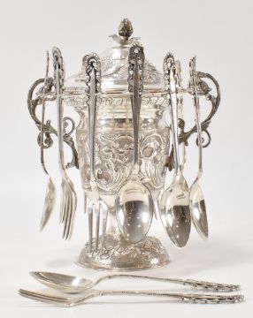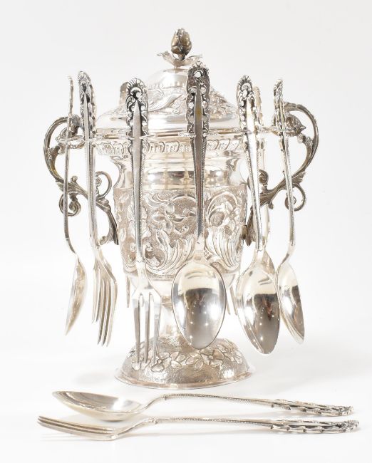 A set of six silver dessert spoons and forks. The desert spoons and forks all having pierced and scrolled terminals. Each marked 800. Total weight 238g. Measures 14cm. Together with a white metal lidded twin handled pot having floral engraving throughout. Unmarked but tests indicate silver. Measures 20cm tall. Weight 311g.