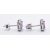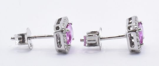 A pair of hallmarked 18ct white gold and sapphire stud earrings earrings. The earrings having central baguette cut pink sapphire surrounded by a halo of round cut diamonds. Sapphire measures 50mm x 35mm. Diamond weight estimated 0.16ct. Total weight 2.42g.
