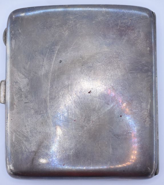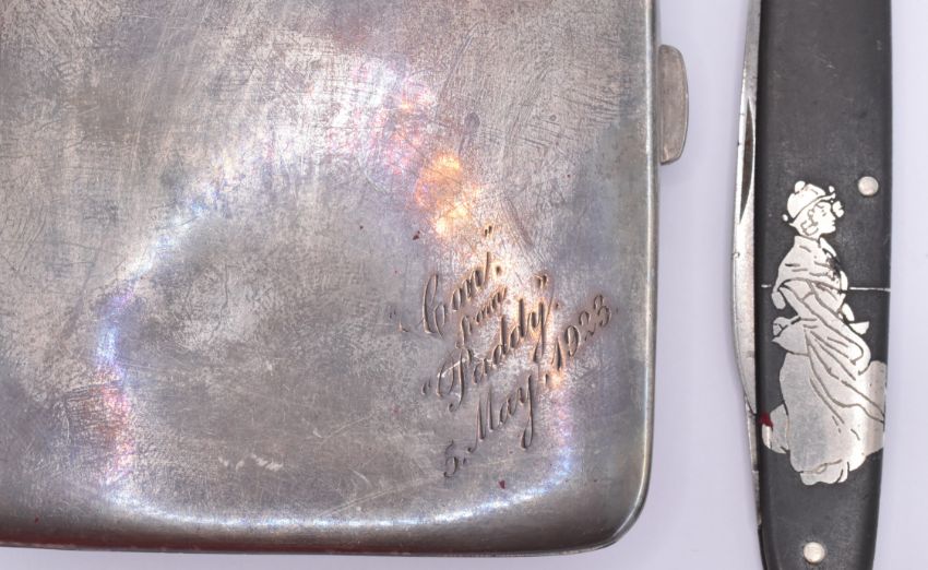 A silver hallmarked cigarette case of plain form being engraved with a message to the corner dated 1923 (hallmarked Birmingham 1921, weight 90.4g, William Hair Haseler), a silver hallmarked pocket knife (hallmarked Sheffield 1941, weight 25.8g) and a niello work folding knife. Cigarette case measures 9.5 x 8cm. Pen knives measures 9cm when closed.